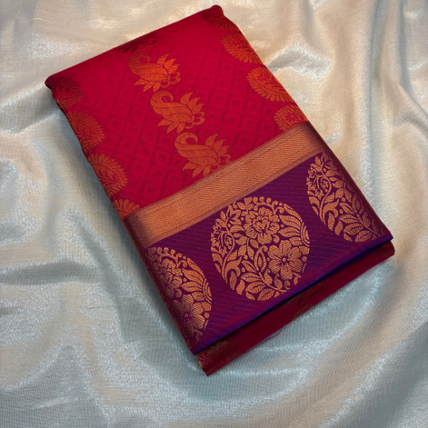 A radiant bridal red drape featuring intricate zari floral medallions along the border. This saree brings a powerful blend of tradition and luxury, crafted to elevate your festive and bridal wardrobe.