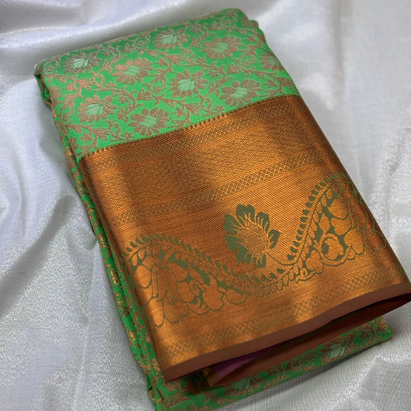A stunning bridal silk saree crafted in a refreshing parrot green shade, elevated with rich golden zari detailing across the body and border. The intricate floral patterns and shimmering finish give it a regal bridal appeal—perfect for marriage functions, muhurtham, and festive ceremonies.