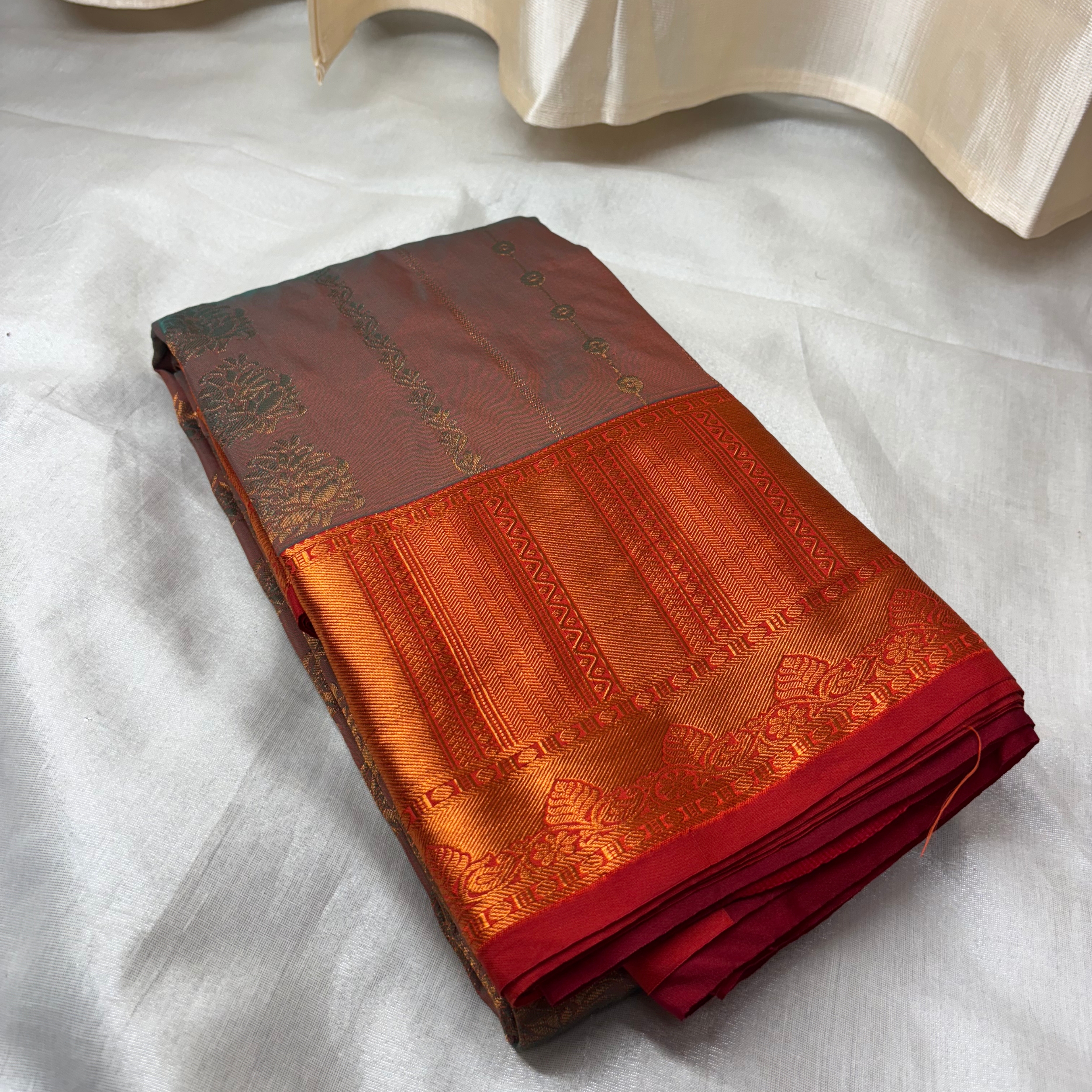 This saree carries delicately woven floral buttas that add charm and sophistication to the overall design. The handcrafted weave gives it a distinct texture and individuality. Perfect for cultural events, festive gatherings, and graceful everyday styling.