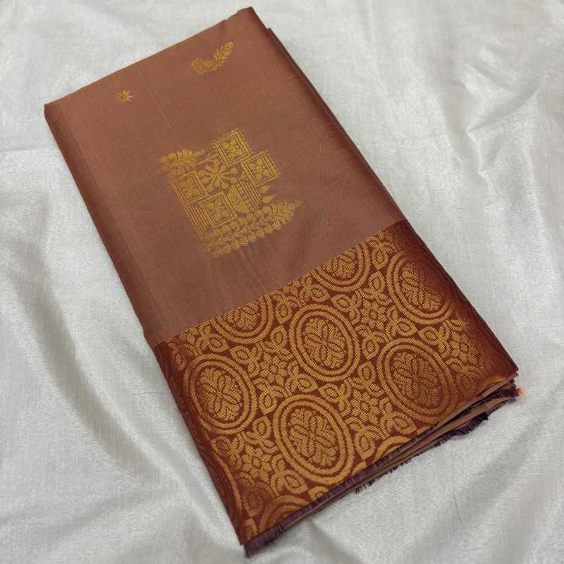 A warm copper brown soft silk saree featuring a seamless, borderless design for a contemporary aesthetic. The smooth fabric is adorned with traditional gold zari motifs that offer a rich, metallic glow.