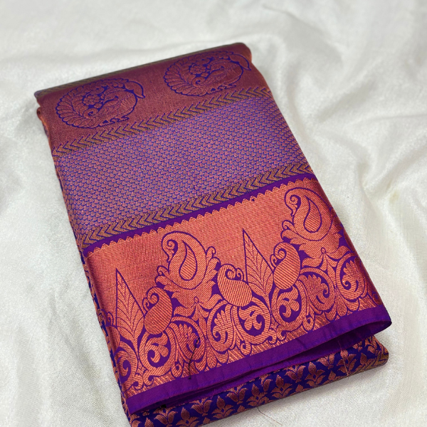 A premium copper-purple silk saree showcasing antique-style peacock and paisley motifs along the border. The body carries a refined micro brocade pattern in a dual-tone weave, offering depth, dimension, and visual richness. A future-forward choice for women seeking elegance with a strong traditional signature.