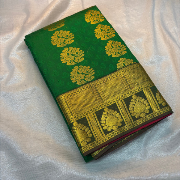 A rich emerald drape showcasing ornate gold brocade patterns for a luxurious, high-value look. The classic motifs and vibrant hue make it an evergreen wardrobe essential for elite festive styling and family celebrations.