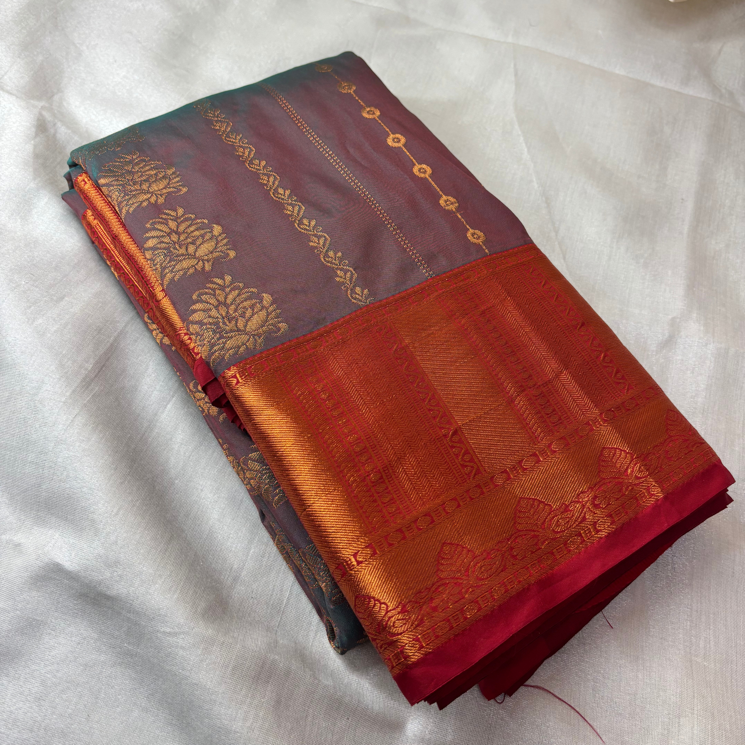 A saree that reflects the soul of handloom weaving, featuring subtle floral buttas woven with precision. The natural drape and breathable texture make it both elegant and practical. This piece embodies timeless tradition and refined craftsmanship.