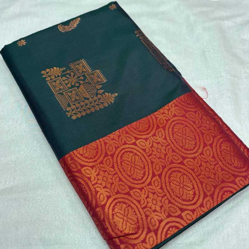 A dark forest green soft silk saree with a clean, borderless finish that emphasizes a long, sleek silhouette. The deep green base provides a striking contrast for the intricate gold floral zari work spread across the body.