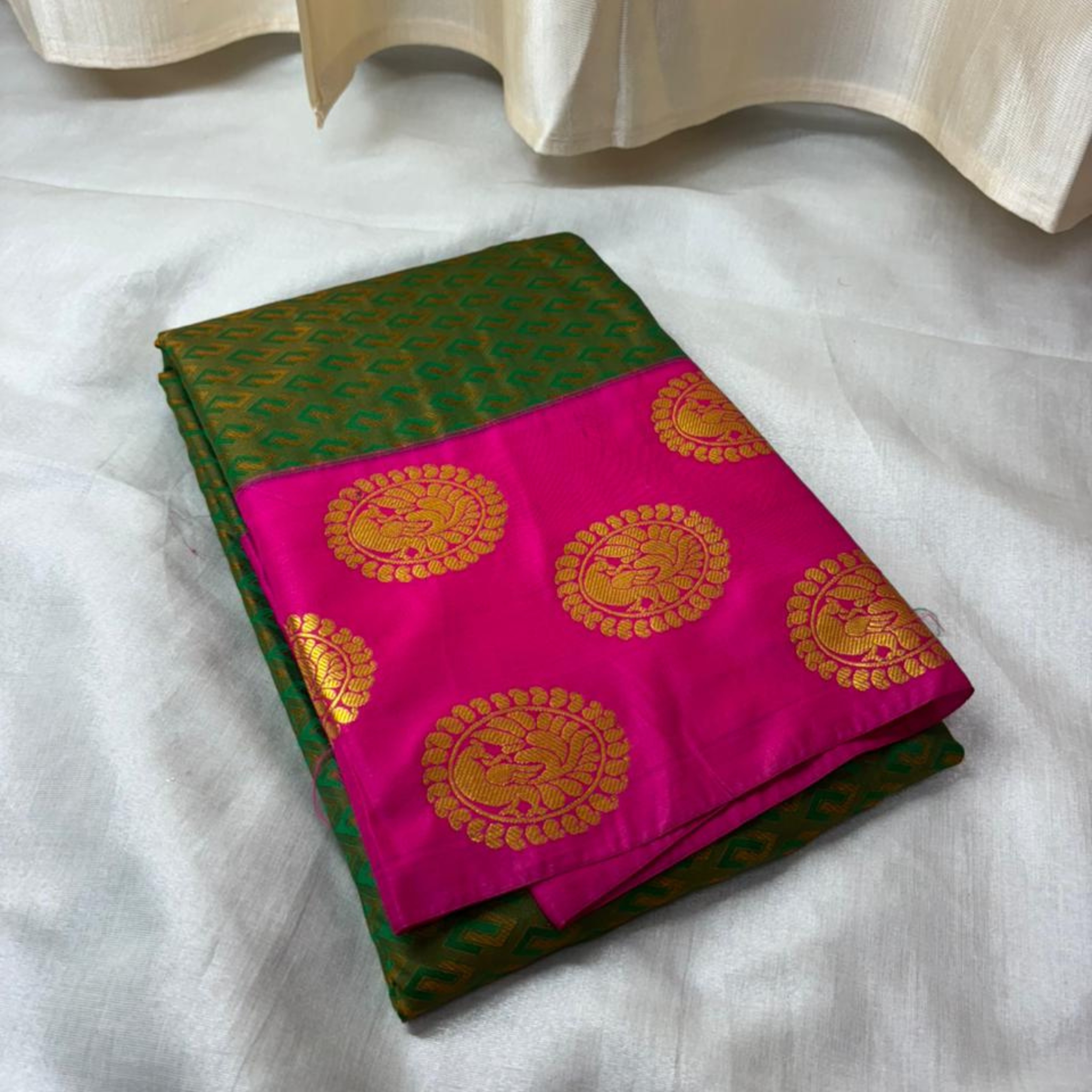 Inspired by classical temple and traditional art forms, this handloom saree features elegant peacock buttas woven with precision and balance. The motifs are thoughtfully placed to enhance the saree’s visual harmony without overwhelming the design. Every thread reflects patience and craftsmanship, resulting in a saree that blends timeless tradition with refined sophistication.