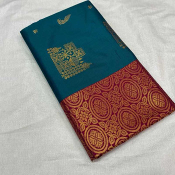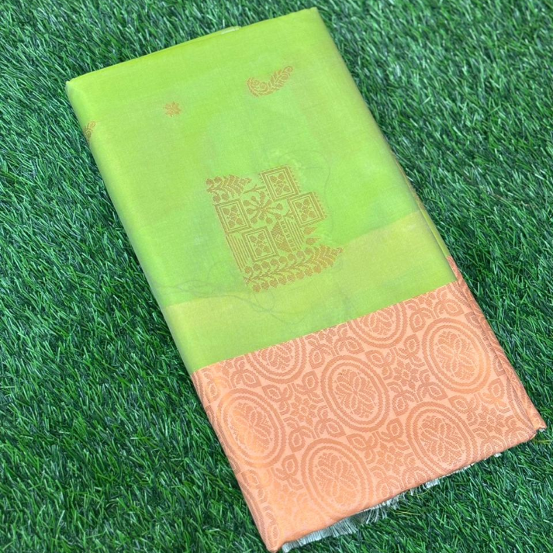 A refreshing lime green body paired with a delicate peach-gold shimmer border. The subtle, warm tones make this a unique and glowy option for summer events or religious functions.