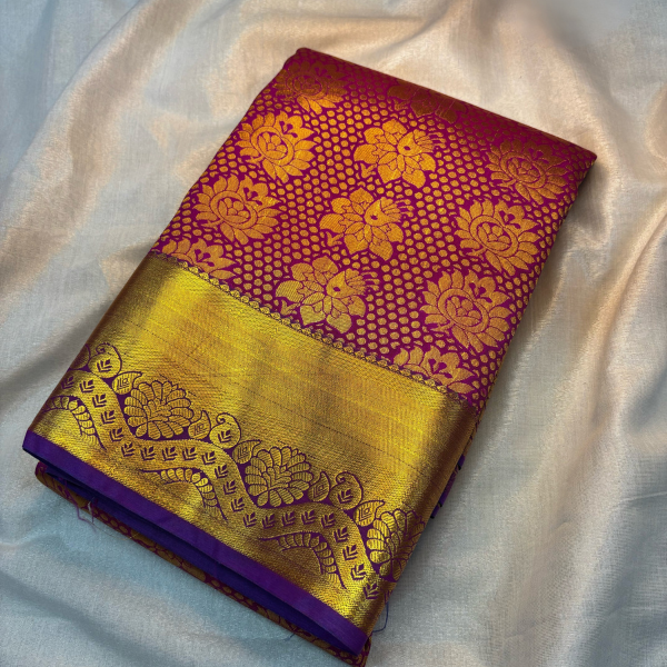 A luxurious magenta silk saree featuring rose-inspired brocade motifs, giving the fabric depth, dimension, and artistry. The broad shimmering gold zari border is finished with floral and wave motifs, ensuring a premium, heritage-infused visual statement. Perfect for festive dressing, traditional ceremonies, and upscale celebrations.