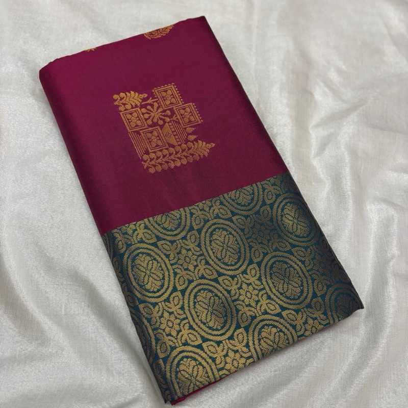 A vibrant magenta wine soft silk saree designed without a traditional border for a fluid drape. The body is accented with delicate gold patterns that add a touch of traditional elegance.