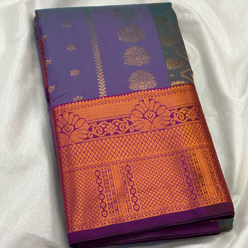 Experience the perfect blend of tradition and sophistication with this exquisite silk saree. The body features a soft Mauve-Lavender hue adorned with signature Vaira Oosi (fine needle-stripe) gold zari lines and delicate floral motifs.