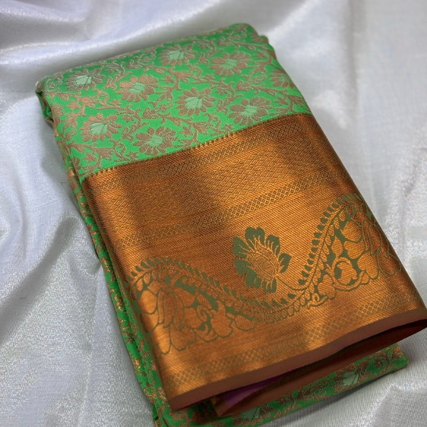This refreshing mint green silk saree showcases a delicate floral brocade pattern throughout the body. The antique copper zari border, highlighted with lotus motifs and intricate weaving, delivers a refined heritage appeal. Ideal for daytime functions, temple ceremonies, and elegant festive wear.