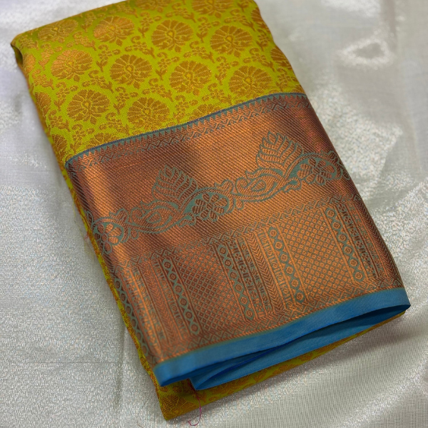 A vibrant mustard green silk saree enriched with intricate gold floral motifs across the body. The copper zari border, highlighted with lotus and vine detailing, brings exceptional depth and richness to the design. A perfect choice for festive celebrations and traditional functions with a contemporary twist.