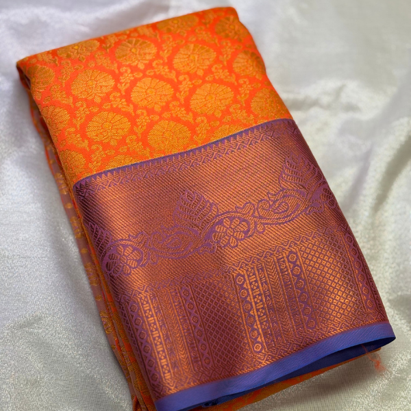 A luminous orange silk saree showcasing ornate zari floral motifs throughout the body. The copper border, complemented by purple zari highlights, carries temple-inspired designs that elevate the traditional appeal. Crafted for bridal events, festivals, and upscale family gatherings.