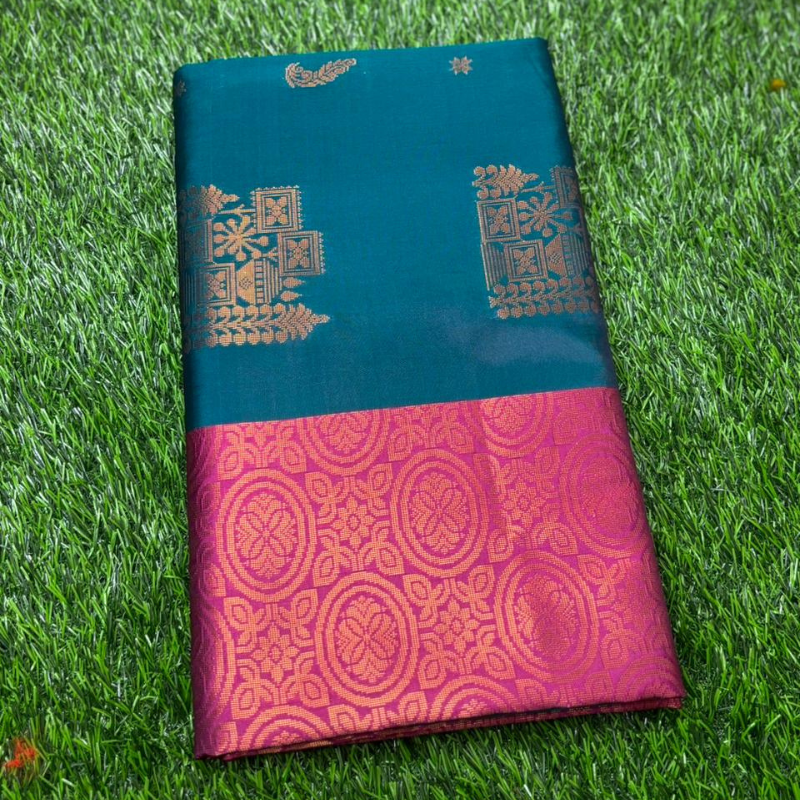 A sophisticated deep peacock teal body complemented by a bright magenta pink border with intricate gold detailing. A regal choice that transitions beautifully from daytime ceremonies to evening receptions.