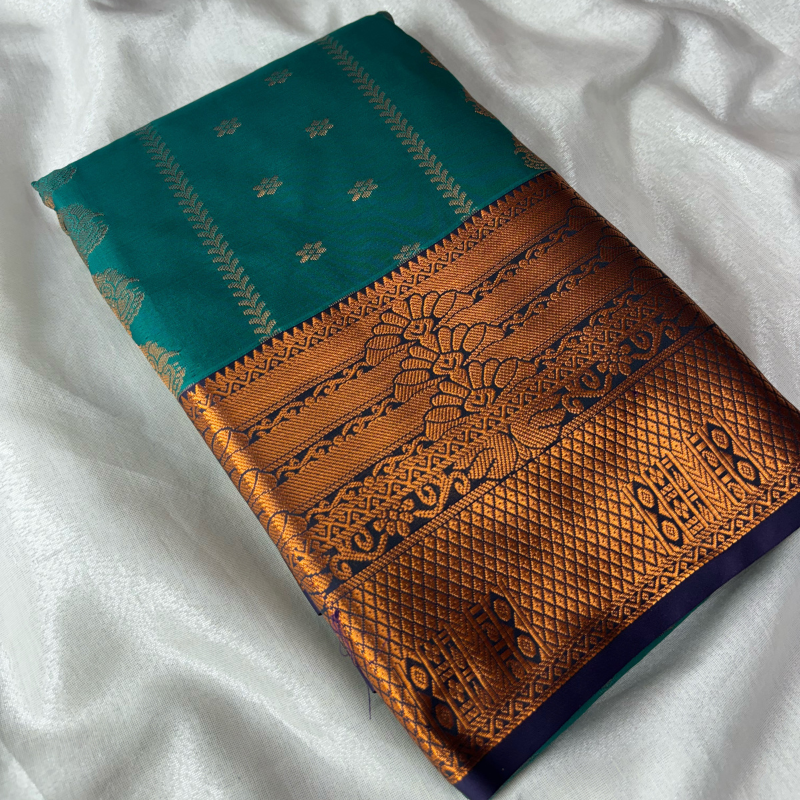 Peacock Green Vaira Oosi Silk is a timeless handwoven saree featuring the traditional Vaira Oosi weave. The rich peacock green body is elegantly adorned with subtle woven buttas, beautifully complemented by a broad antique gold zari border that adds classic South Indian grandeu