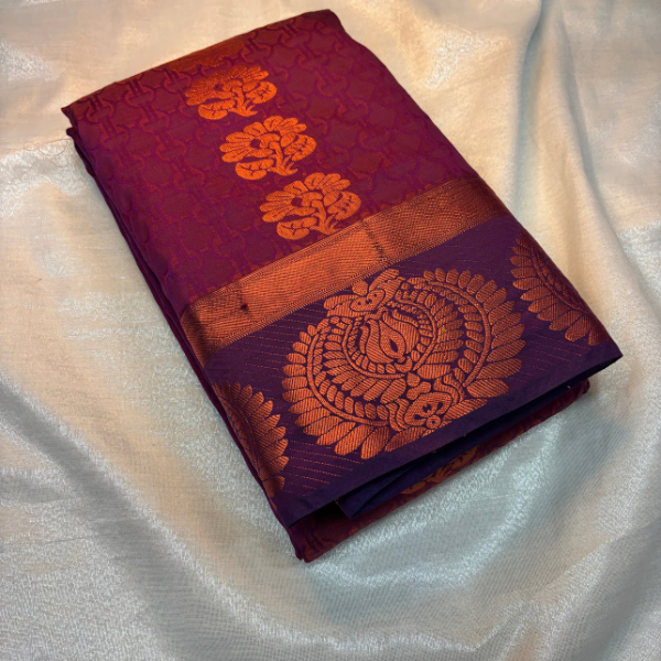 A powerful blend of plum purple and copper zari artistry, designed with a majestic peacock pattern that steals the spotlight effortlessly. Ideal for bridesmaids, festive events, and anyone seeking a bold yet graceful festive look.