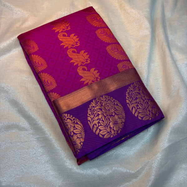 This saree showcases luxurious paisley brocade paired with a copper zari border for a majestic finish. Perfect for receptions, engagements, and festive celebrations.
