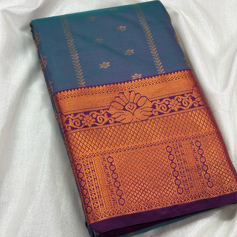 Royal Blue Vaira Oosi Silk features a deep blue body woven with the traditional Vaira Oosi pattern and delicate gold zari buttas. Finished with a broad antique gold zari border with subtle contrast detailing, this saree reflects classic South Indian craftsmanship and is perfect for festive occasions, weddings, and traditional functions.
