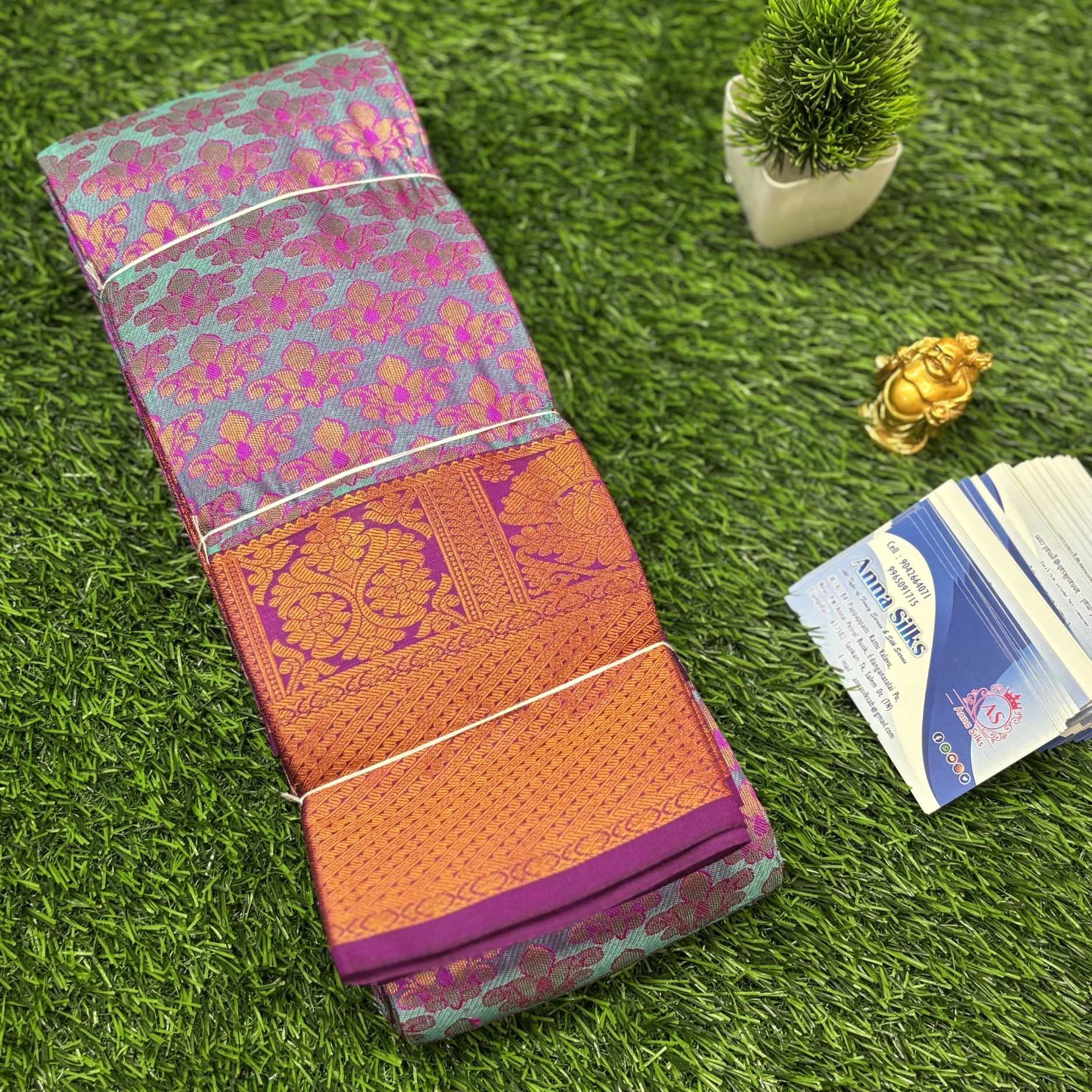 A silk saree glowing with a pink–orange palette and adorned with opulent gold brocade motifs. Its luxurious finish and bold festive energy make it perfect for occasions where you want to stand out elegantly