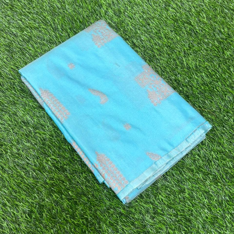 A refreshing sky blue silk saree featuring delicate silver-toned traditional patterns throughout the body. The monochromatic elegance makes it a lightweight and graceful choice for daytime events.