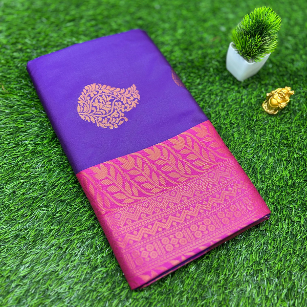 A graceful soft silk saree in a rich purple shade, beautifully complemented by a vibrant pink zari border. The smooth texture and subtle shine add elegance to every drape, making it a perfect pick for festive occasions, cultural events, and special gatherings. Stylish, comfortable, and classically appealing.