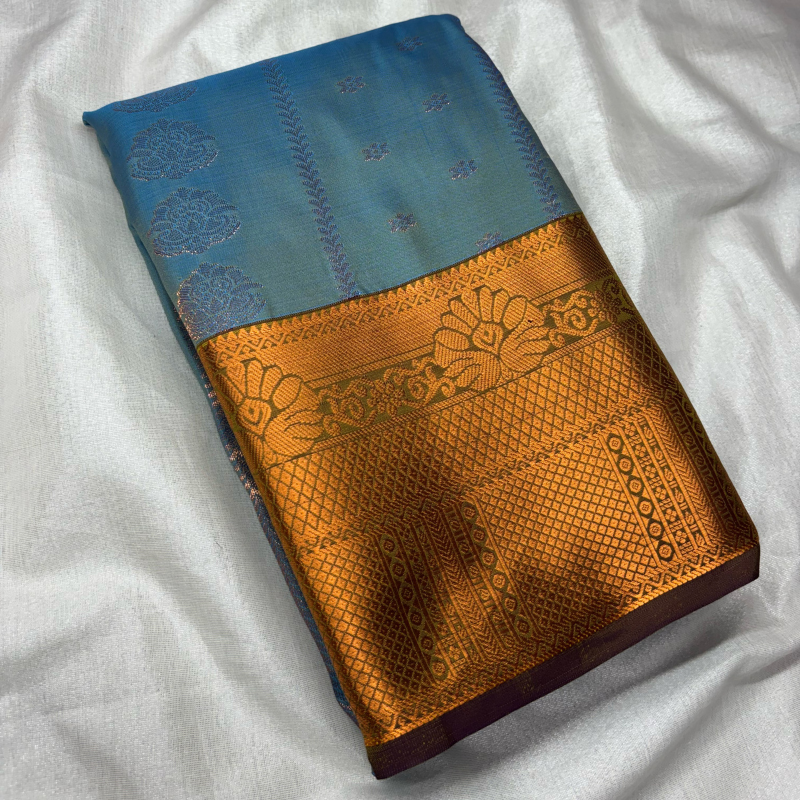 Steel Blue Vaira Oosi Silk features a muted blue body enhanced with traditional Vaira Oosi weaving and fine gold zari buttas. Paired with a broad antique gold zari border, this saree offers understated elegance and classic appeal, making it perfect for festive occasions and traditional wear.