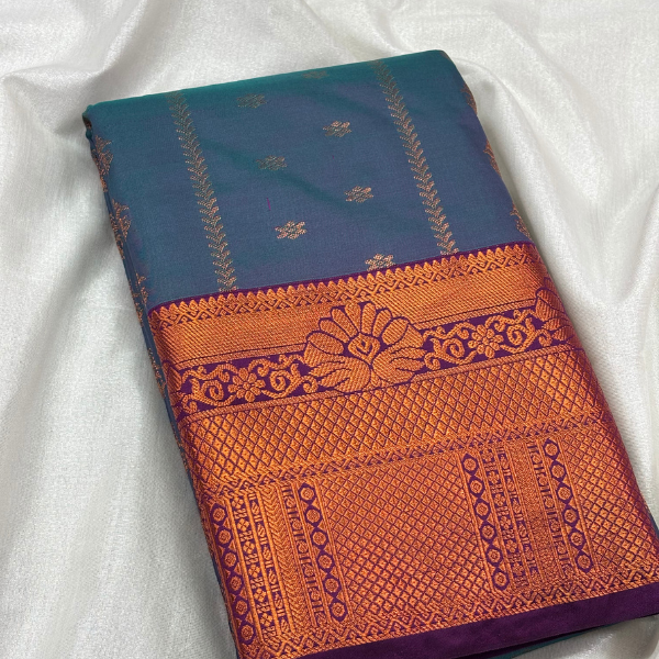 A graceful teal–blue silk saree featuring delicate gold buttas arranged in a minimal, elegant layout. The saree is anchored with a grand copper zari border highlighted by lotus motifs, geometric weaves, and intricate floral vines. A refined pick for festive celebrations, poojas, and traditional occasions.