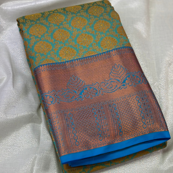 This sophisticated teal green silk saree features woven gold floral motifs that create a refined and elegant texture. The copper zari border enhanced with blue-toned motifs adds a refreshing contrast. A versatile pick for festive daywear, poojas, and elegant seasonal celebrations.