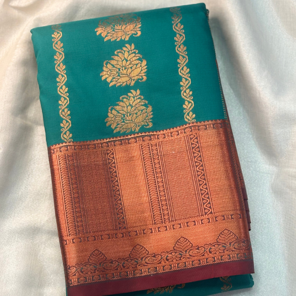 This teal green silk saree is crafted with stunning vertical gold floral vines, delivering a refined and elegant finish. The copper-red border adds heritage richness, making this piece ideal for temple events, receptions, and cultural festivities.