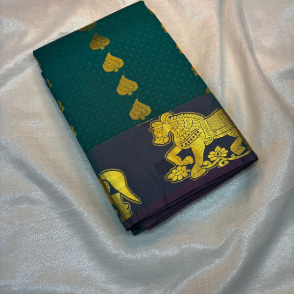 A standout teal saree featuring rare handcrafted golden horse motifs on the border. The unique design storytelling makes this saree a conversation starter for any festive or traditional occasion.