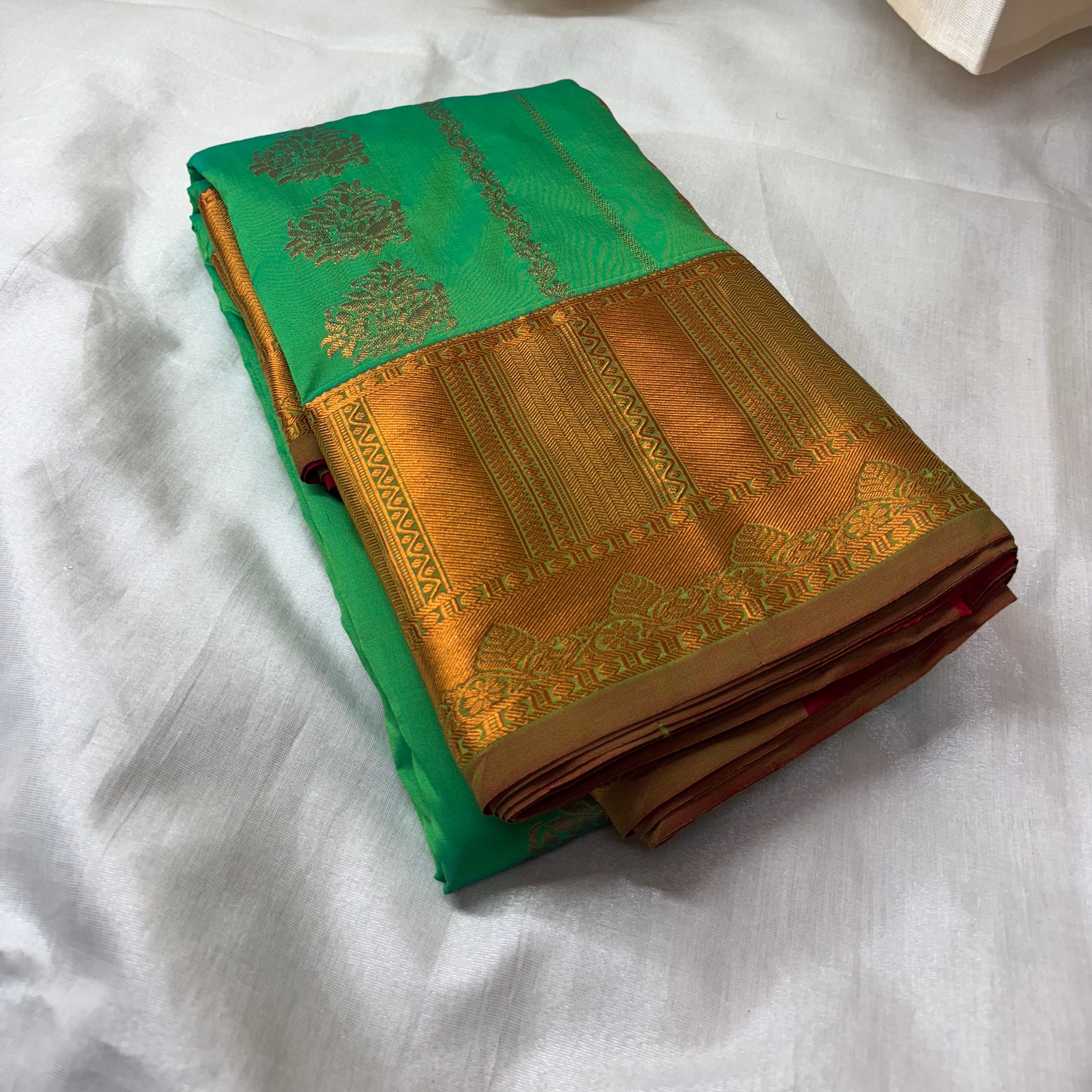 A beautifully balanced saree where floral buttas follow a rhythmic pattern, reflecting the artistry of skilled weavers. The handcrafted texture brings warmth and richness to the drape. This saree stands as a symbol of slow fashion and enduring tradition.