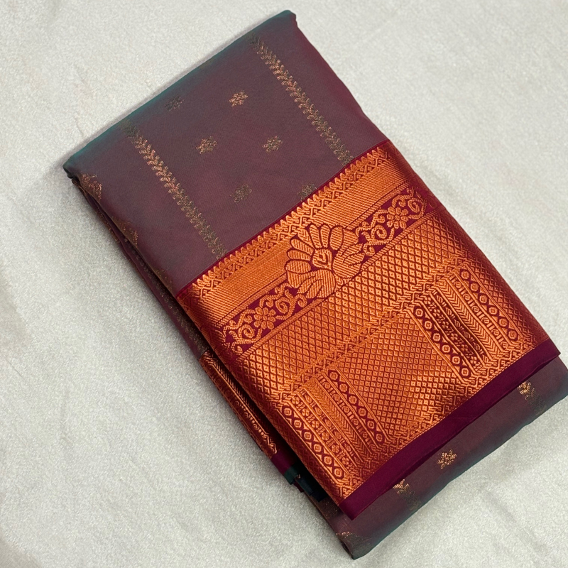 Experience the perfect blend of tradition and sophistication with this exquisite silk saree. The body features a deep Wine Maroon hue adorned with signature Vaira Oosi (fine needle-stripe) gold zari lines and delicate floral motifs.